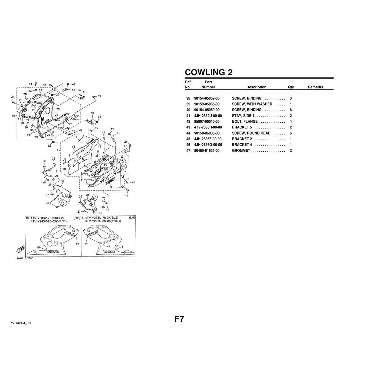 This comprehensive 150+ page parts manual covers the Yamaha YZF600RJ motorcycle, providing detailed exploded diagrams, part numbers, and assembly illustrations for every component on this high-performance sport bike.